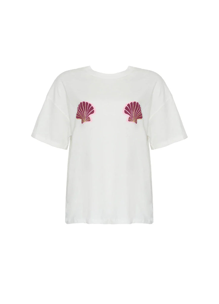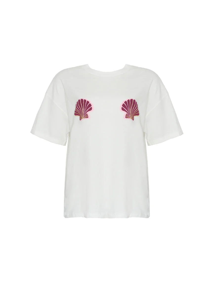 Camiseta oversize con estampado de conchas y detalles dorados bordados. Perfecta para un look casual y relajado.