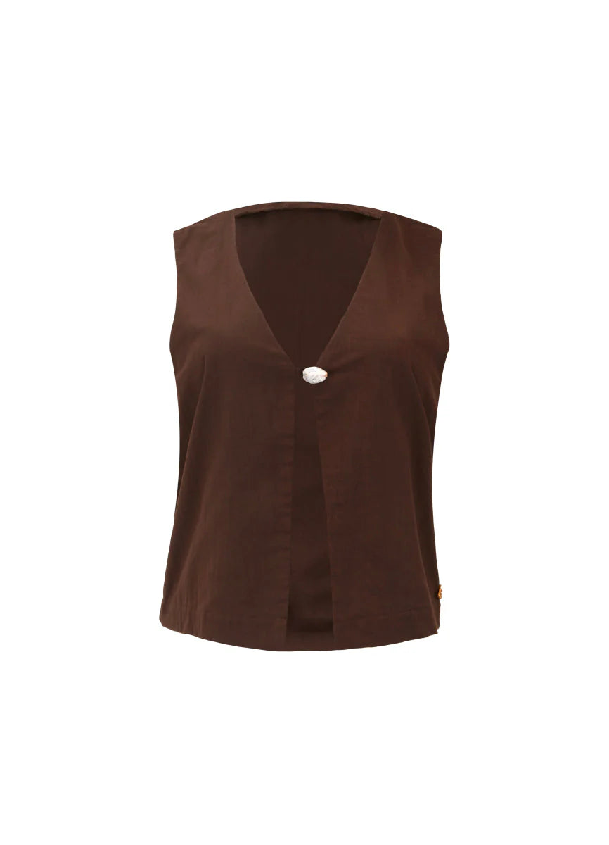 Una prenda versátil que redefine la elegancia sin esfuerzo, el chaleco Eden Eternal Sands destaca por su tono chocolate intenso. Este chaleco sin mangas presenta un escote profundo en V y un cierre frontal con botón de piedra pulida, agregando un toque artesanal. Su tejido liviano y corte relajado lo hacen ideal para superponer sobre trajes de baño o lucirlo con un estilo casual-chic fuera de la playa.