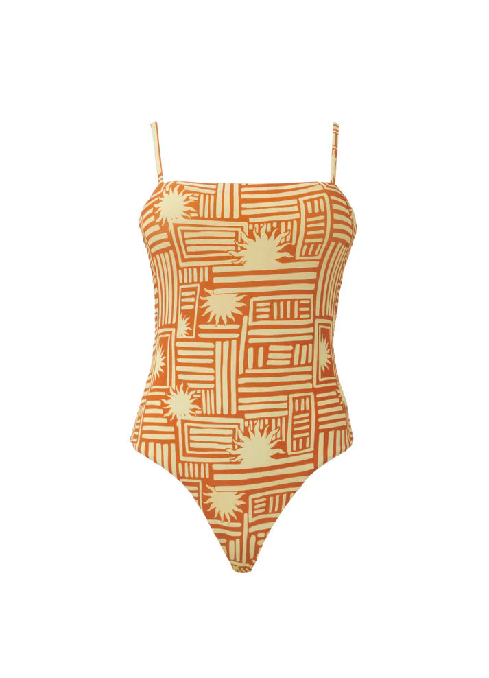 El entero Silvi Sun Essence combina elegancia retro con un diseño geométrico cautivador; con un estampado exclusivo de líneas y formas geométricas en tonos cálidos que evocan los patrones artesanales mediterráneos. El corte clásico de tiras finas ajustables y escote recto ofrece un fit favorecedor, mientras que la cobertura completa proporciona confort y confianza. El diseño atemporal se adapta perfectamente desde la playa hasta el poolside.